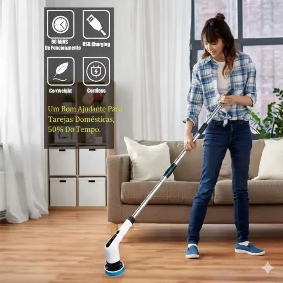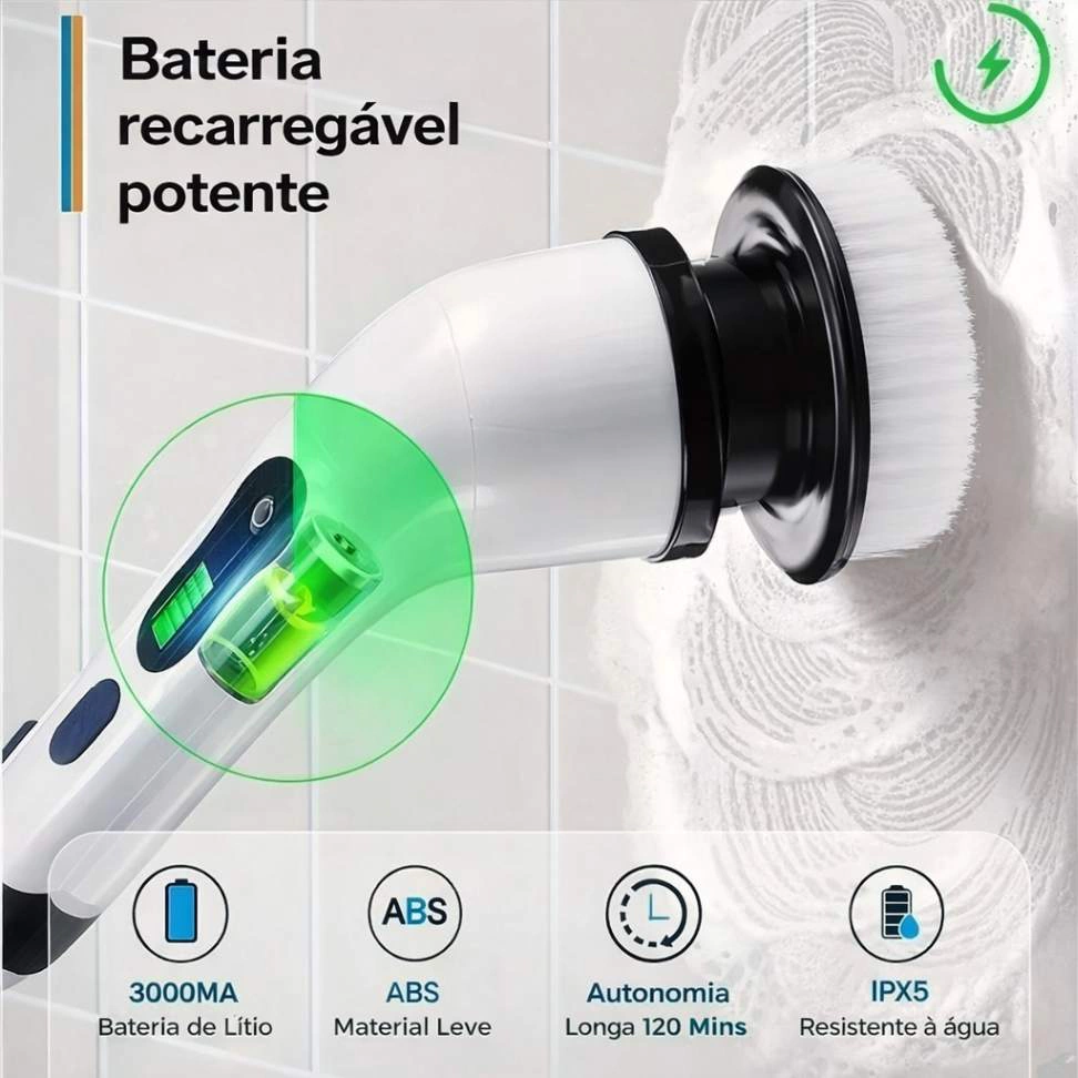 O movimento elétrico faz a fricção constante que a mão não consegue manter, soltando resíduos difíceis e acelerando a limpeza em áreas críticas como banheiro, cozinha, rejuntes e cantos.