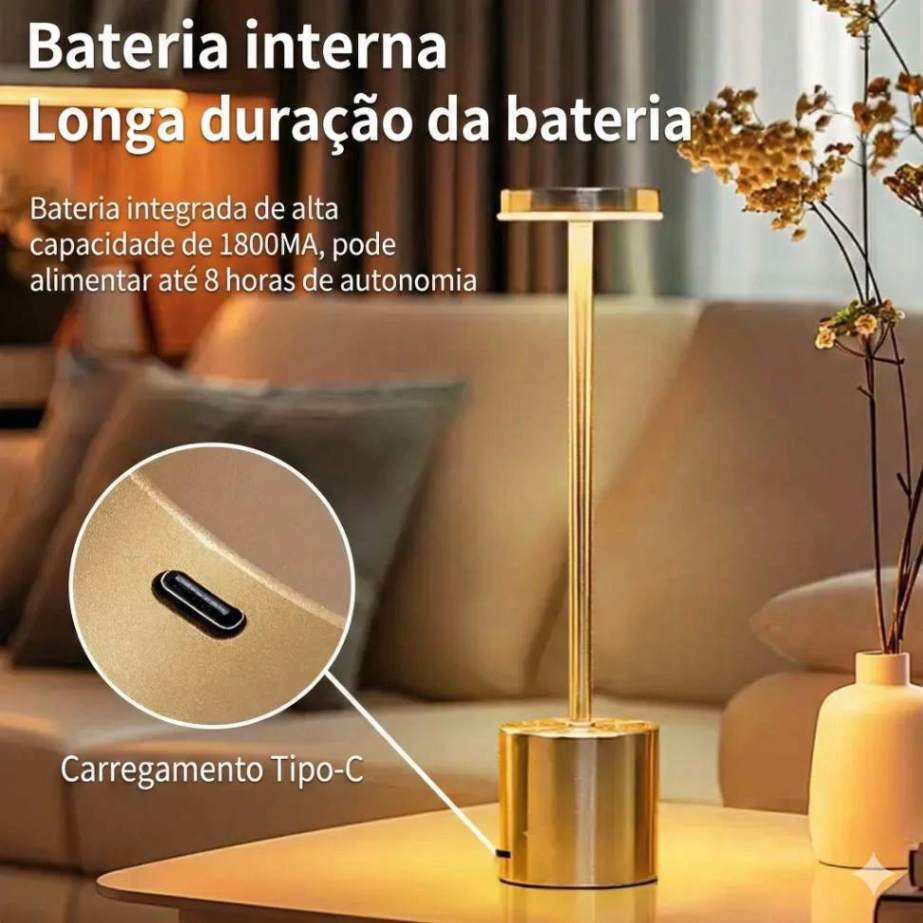 O sistema de toque permite alternar entre luz quente, neutra e fria, além de regular o brilho de forma contínua. O design sem fio e recarregável facilita posicionar a luminária onde quiser, sem depender de tomadas.