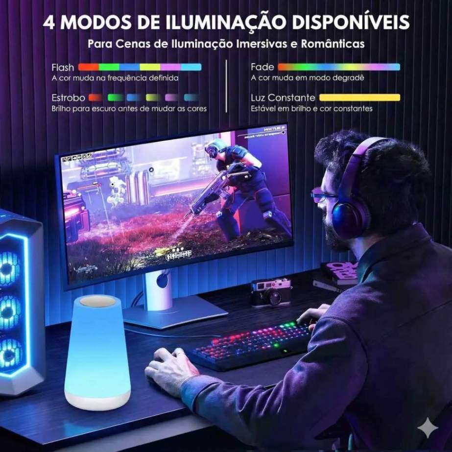 Com 13 cores, níveis de brilho ajustáveis e diferentes modos de iluminação, você cria desde um clima relaxante até um visual mais vibrante. Ideal para quartos, salas, mesas de cabeceira ou qualquer espaço que precise de personalidade.