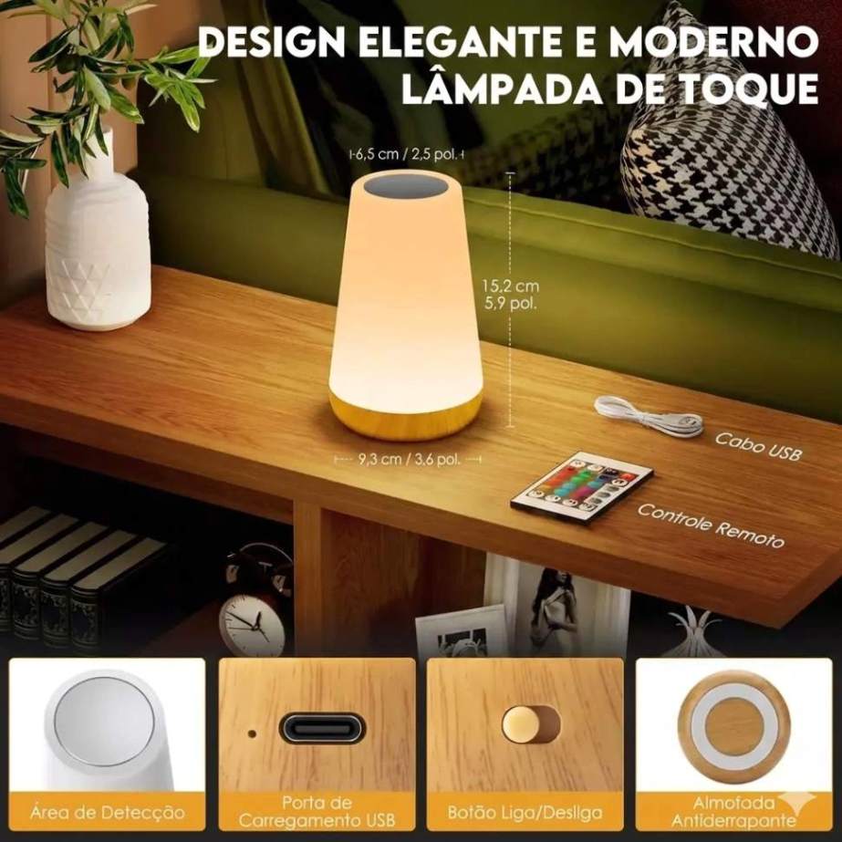 Toque na área sensível da luminária ou utilize o controle remoto para ligar, desligar, mudar cores, ajustar o brilho ou selecionar modos. Também é possível programar o desligamento automático conforme a necessidade.